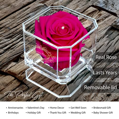 ✮ TRENDY BOX – Arrivando in questa splendida scatola di diamanti acrilici 8 cm x 8 cm x 8 cm con un logo oro Eternal Petals con un cristallo Swarvoski trasparente, troverai una vera rosa perfettamente fiorita in un colore davvero bello. Il massimo del romanticismo classico, questa rosa sfida la natura con il suo sorprendente pigmento magico, che puoi godere e ammirare per anni